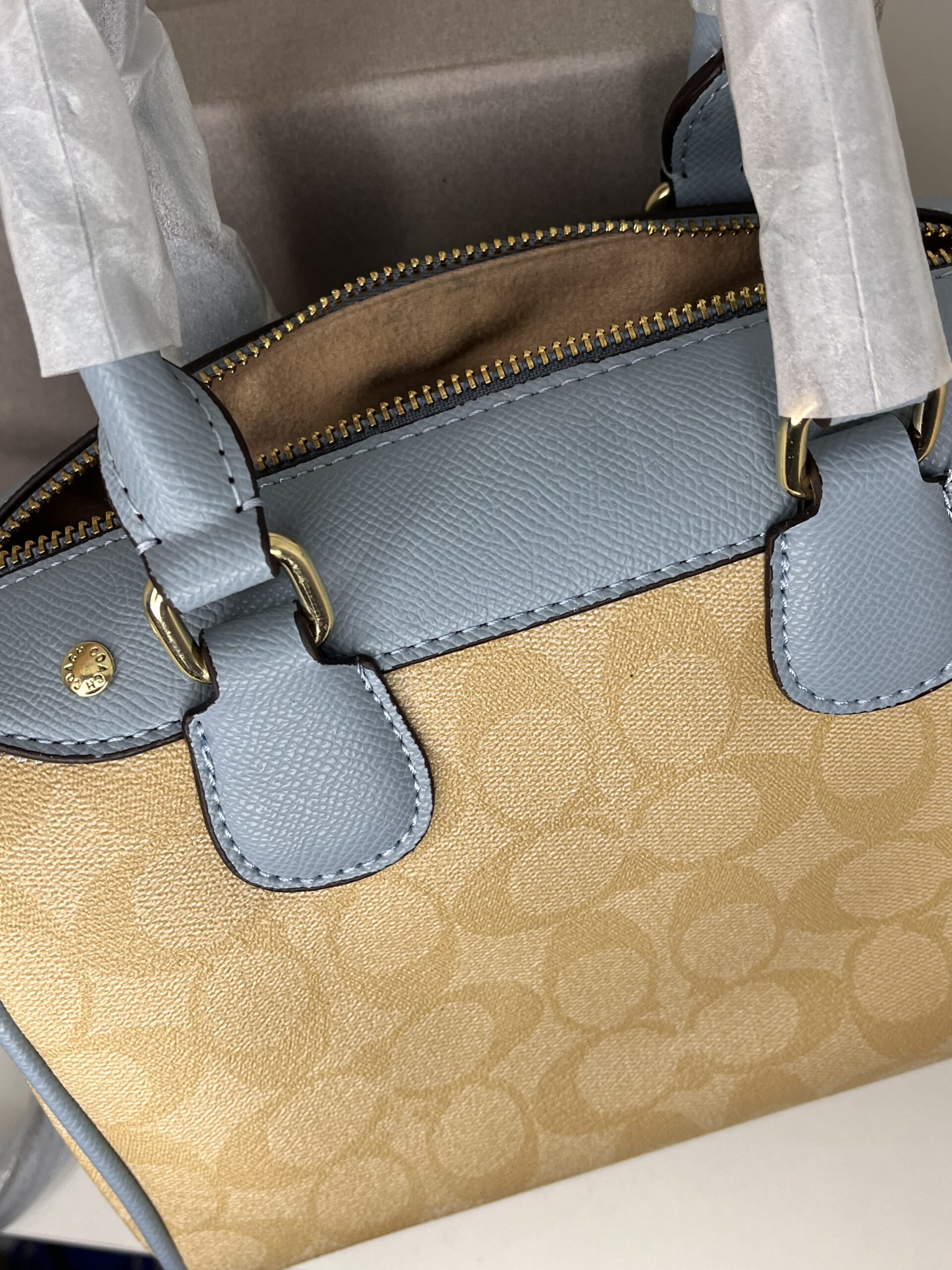 Matière : Toile enduite monogrammée + cuir grainé bleu ciel