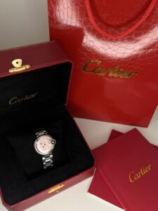Cadran : Rose pâle, chiffres romains noirs, aiguilles bleuies signature Cartier