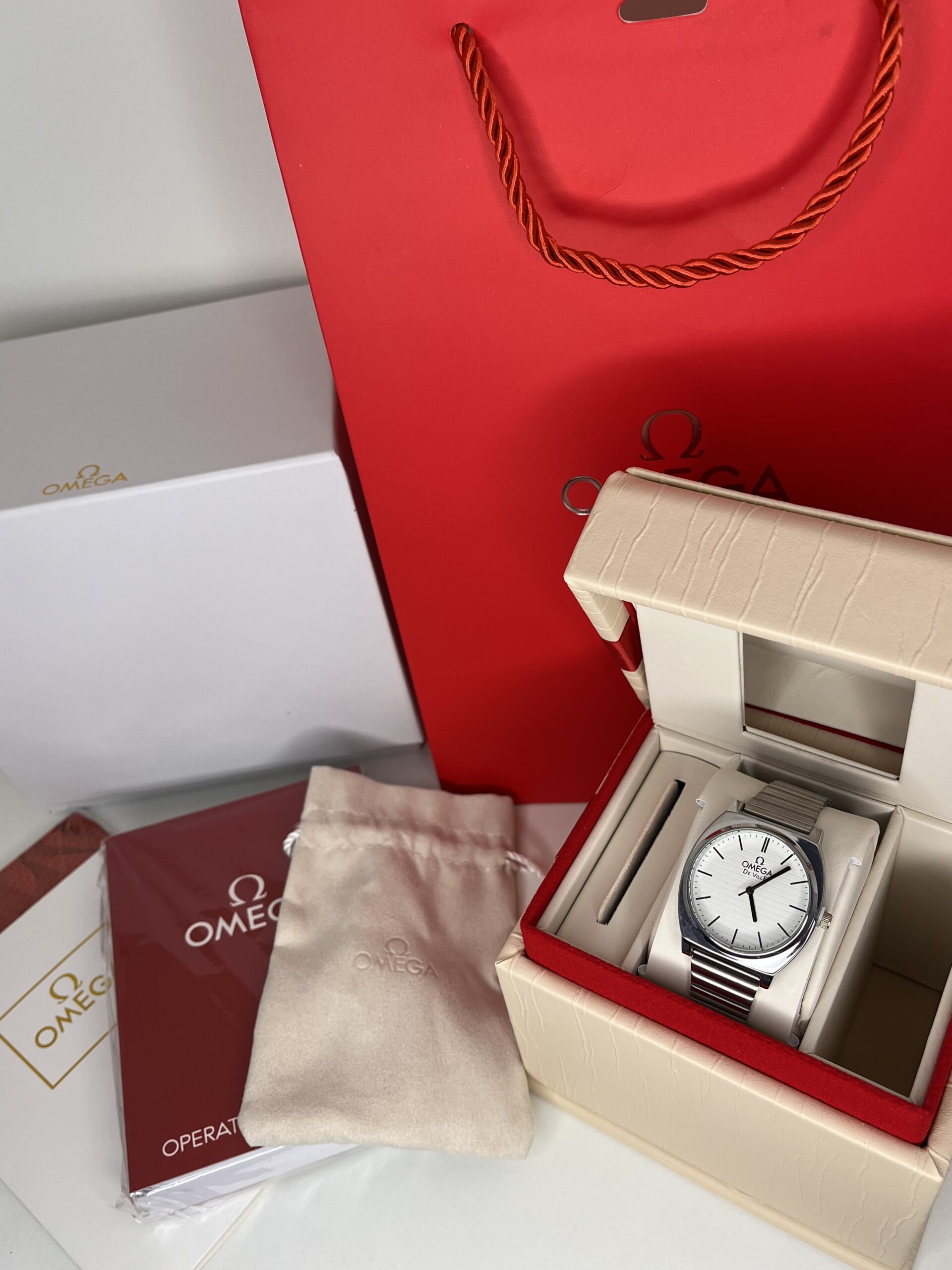 • Cadran : Argenté avec index fins noirs + logo OMEGA De Ville à 12h