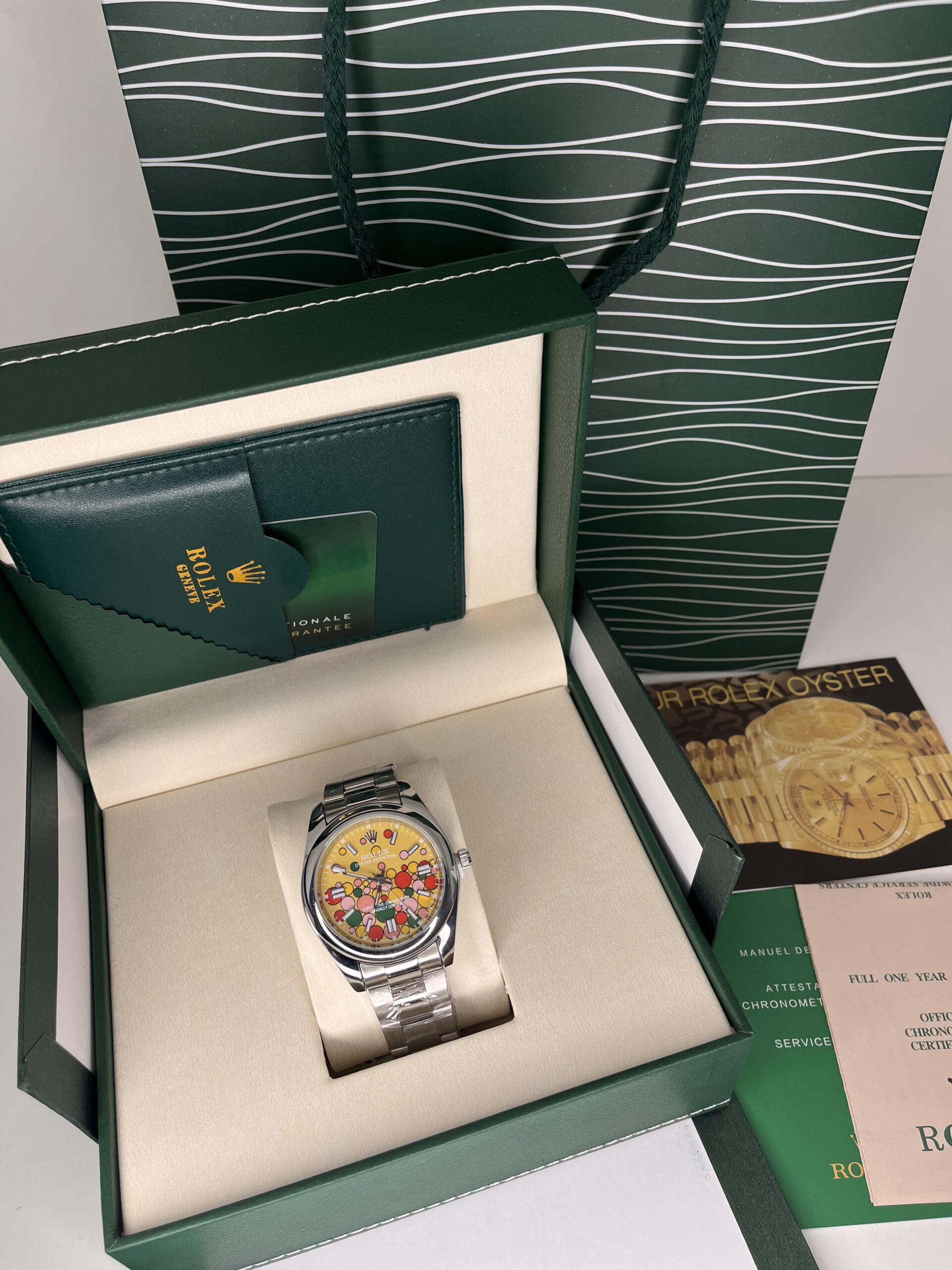 • Cadran : Jaune avec motif artistique multicolore (“Art Dial”) – édition personnalisée unique